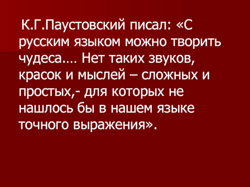 Слайд 3 К.Г.Паустовский писал: «С русским языком можно творить чудеса.… Нет
