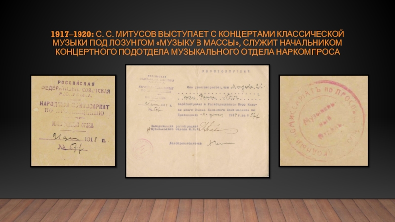 1917‒1920: С. С. Митусов выступает с концертами классической музыки под лозунгом «Музыку в массы», служит начальником концертного