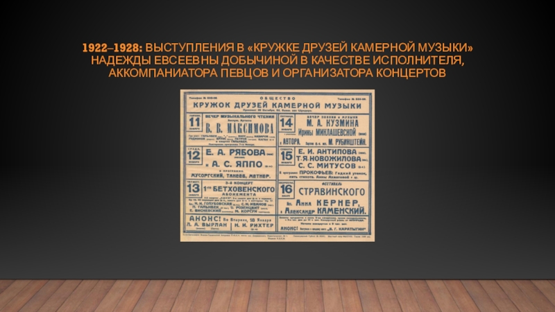 Слайд 181922‒1928: выступления в «кружке друзей камерной музыки» надежды Евсеевны Добычиной в