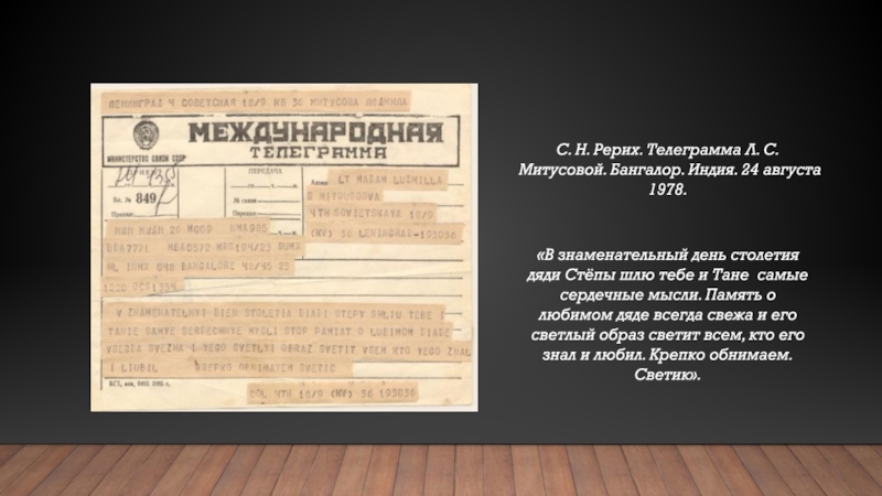 С. Н. Рерих. Телеграмма Л. С. Митусовой. Бангалор. Индия. 24 августа 1978.«В знаменательный день столетия дяди Стёпы