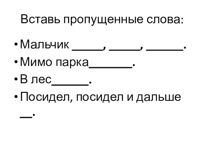 Вставь пропущенные слова:Мальчик _____, _____, ______.Мимо парка_______.В лес______. Посидел, посидел и дальше __.