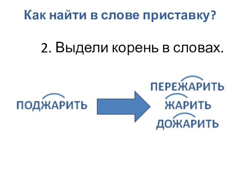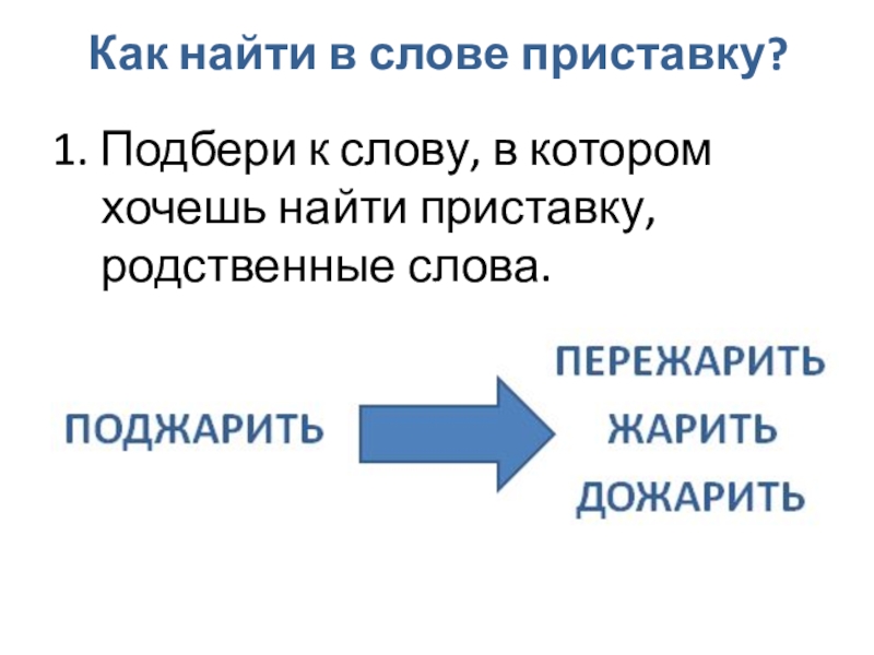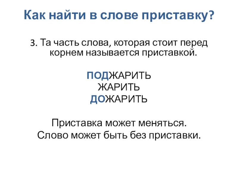 Как найти в слове приставку?3. Та часть слова, которая стоит перед корнем называется приставкой.ПОДЖАРИТЬЖАРИТЬДОЖАРИТЬПриставка может меняться. Слово