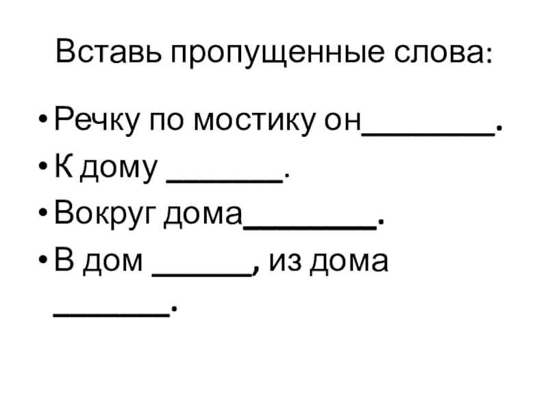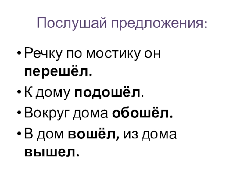 Послушай предложения:Речку по мостику он перешёл.К дому подошёл.Вокруг дома обошёл.В дом вошёл, из дома вышел.