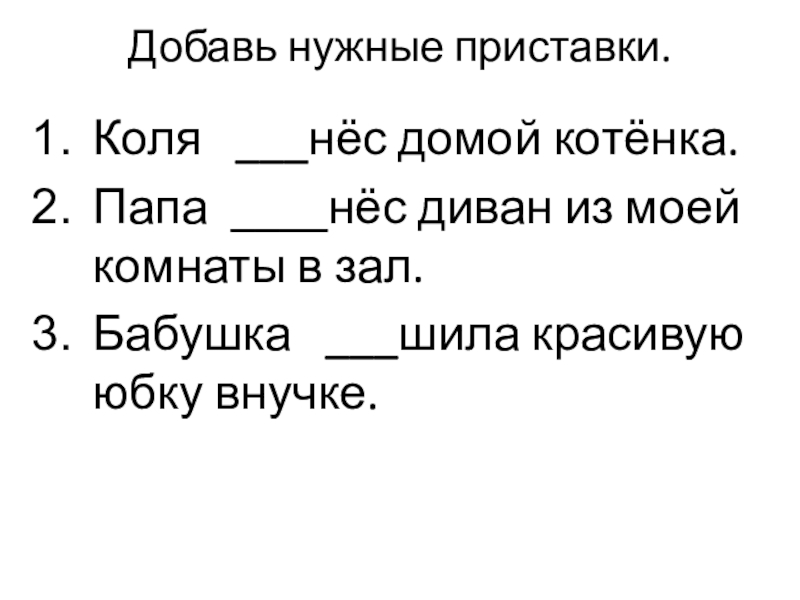 Добавь нужные приставки.Коля  ___нёс домой котёнка.Папа ____нёс диван из моей комнаты в зал.Бабушка  ___шила красивую