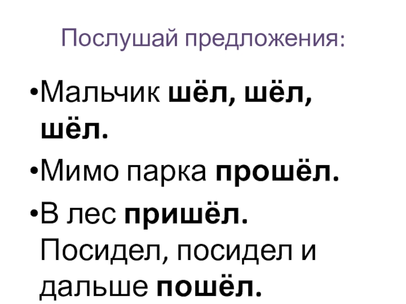 Послушай предложения:Мальчик шёл, шёл, шёл.Мимо парка прошёл.В лес пришёл. Посидел, посидел и дальше пошёл.