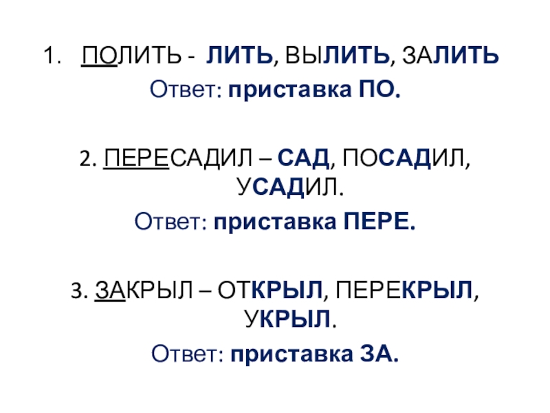 ПОЛИТЬ - ЛИТЬ, ВЫЛИТЬ, ЗАЛИТЬОтвет: приставка ПО. 2. ПЕРЕСАДИЛ – САД, ПОСАДИЛ, УСАДИЛ.Ответ: приставка ПЕРЕ.3. ЗАКРЫЛ –