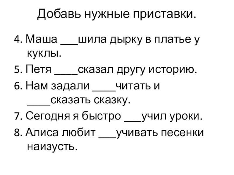 Добавь нужные приставки.4. Маша ___шила дырку в платье у куклы.5. Петя ____сказал другу историю.6. Нам задали ____читать
