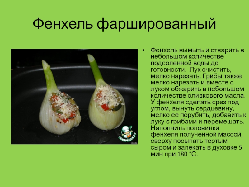 Наполнить половинки фенхеля полученной массой, сверху посыпать тертым сыром и запекать в духовке 5 мин при 180 °С.