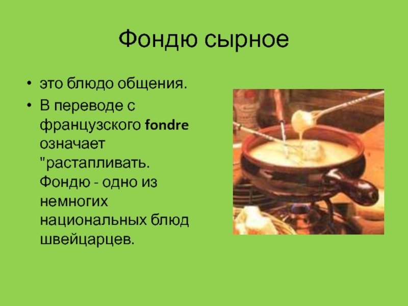 "растапливать. Фондю - одно из немногих национальных блюд швейцарцев.