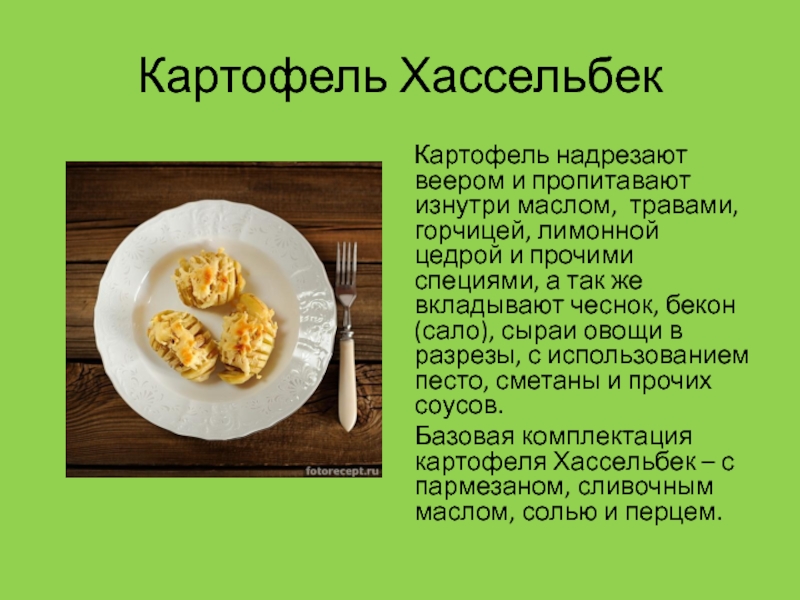 Базовая комплектация картофеля Хассельбек – с пармезаном, сливочным маслом, солью и перцем.