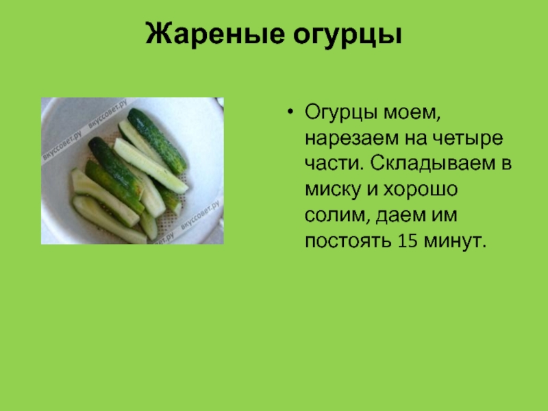 Огурцы нарежьте на длинные брусочки. Разогрейте