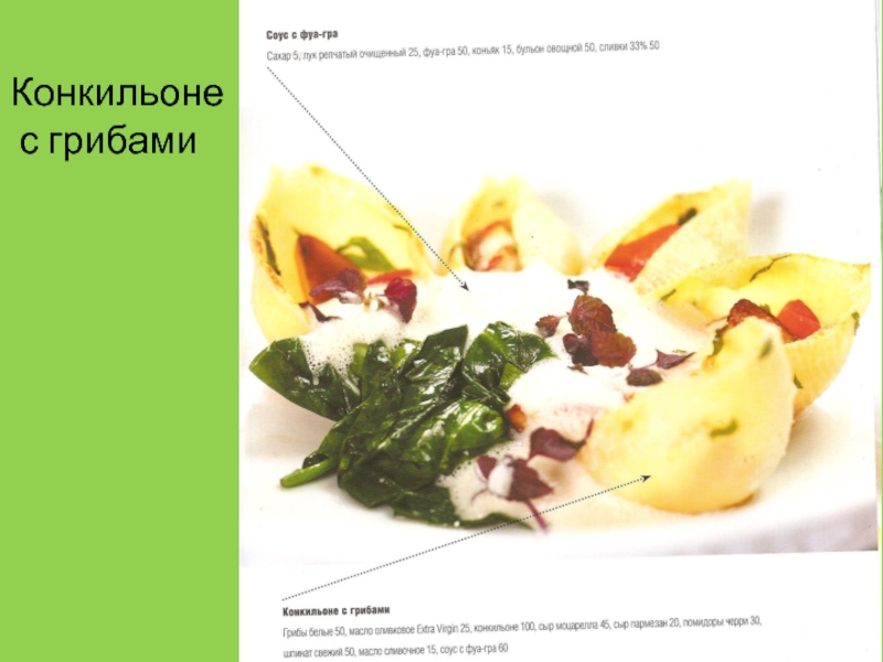 Свежие листья шпината обжарить на сливочном масле, выложить на тарелку и сверху разместить запеченные конкильоне. Полить соусом из сифона.