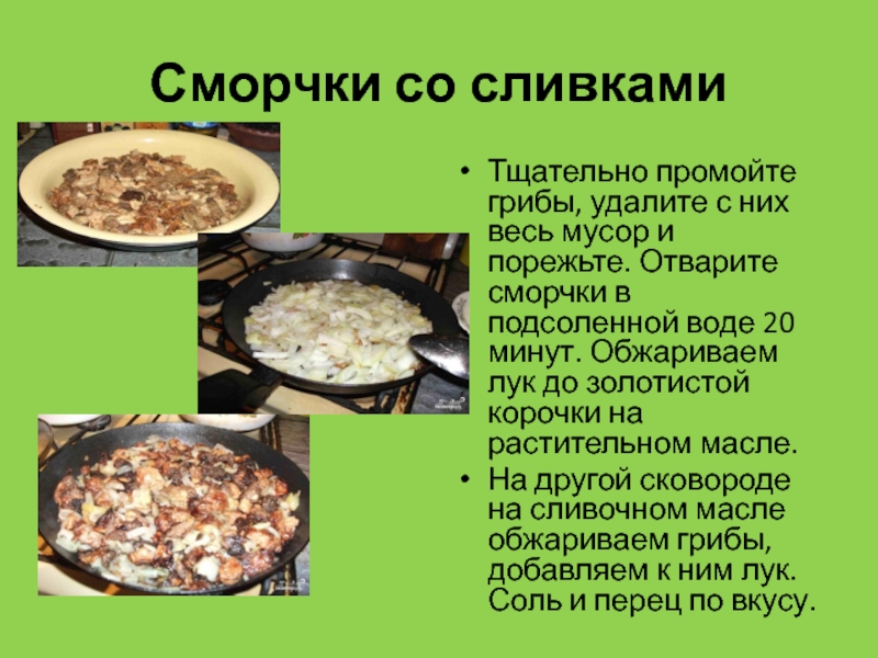 и порежьте. Отварите сморчки в подсоленной воде 20 минут. Обжариваем