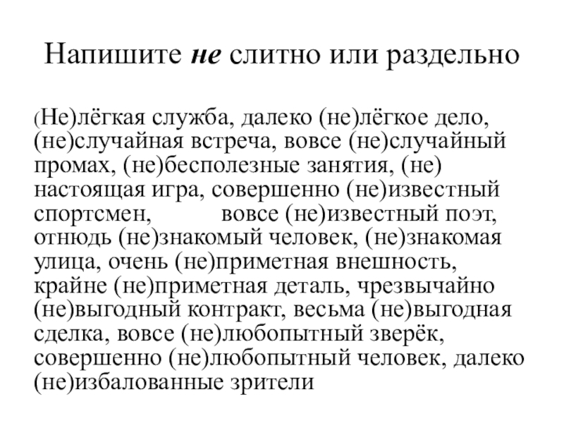 не известный поэт, отнюдь не знакомый человек, незнакомая улица, очень неприметная внешность, крайне неприметная деталь, чрезвычайно невыгодный контракт, весьма невыгодная сделка, вовсе не любопытный зверек, совершенно нелюбопытный человек, далеко не избалованные зрители