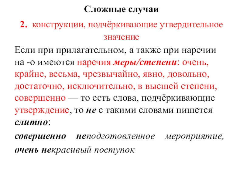 чрезвычайно, явно, довольно, достаточно, исключительно, в высшей степени, совершенно — то есть слова, подчёркивающие утверждение, то не с такими словами пишется слитно: