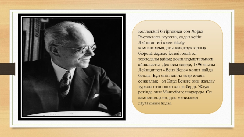 Слайд 4Колледжді бітіргеннен соң Хорьх Ростоктағы зауытта, содан кейін Лейпцигтегі кеме
