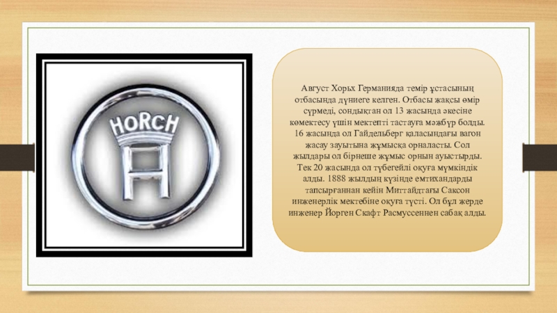 Слайд 3Август Хорьх Германияда темір ұстасының отбасында дүниеге келген. Отбасы жақсы