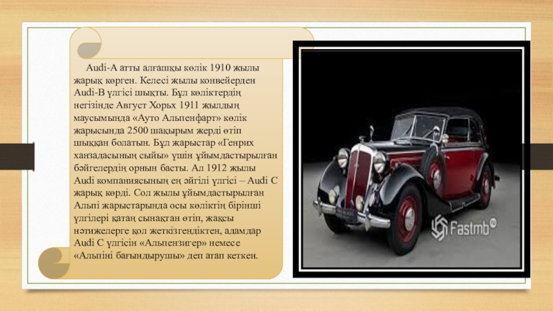 Слайд 8 Audi-A атты алғашқы көлік 1910 жылы жарық