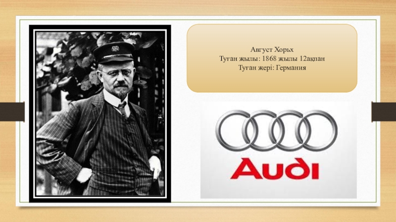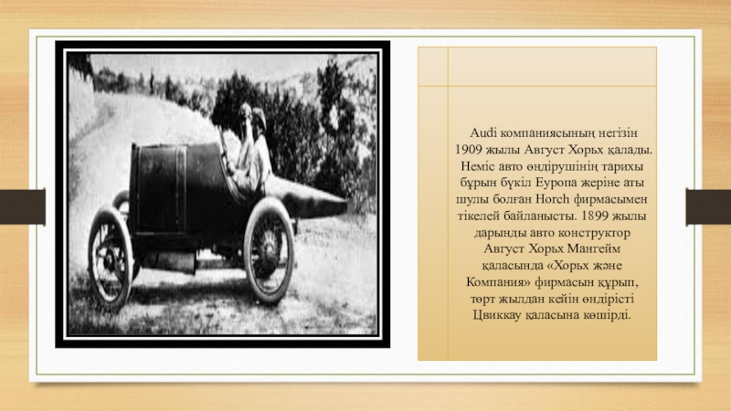 Слайд 6 Audi компаниясының негізін 1909 жылы Август Хорьх қалады. Неміс