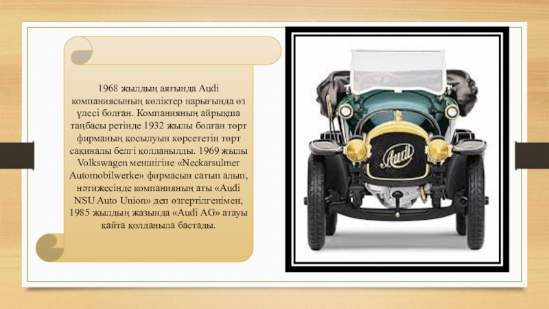 Слайд 101968 жылдың аяғында Audi компаниясының көліктер нарығында өз үлесі болған.