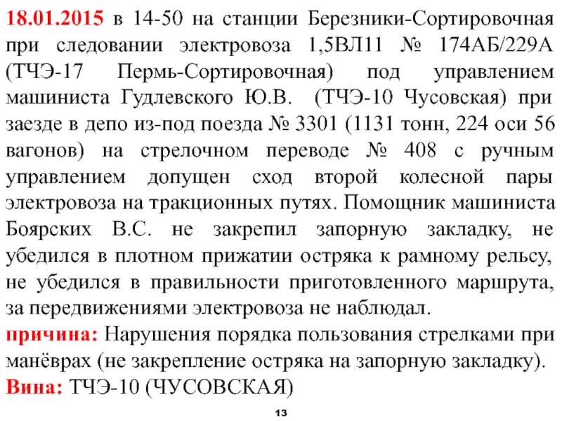Чусовская) при заезде в депо из-под поезда № 3301 (1131 тонн, 224 оси 56 вагонов) на стрелочном переводе № 408 с ручным управлением допущен сход второй колесной пары электровоза на тракционных путях. Помощник машиниста Боярских В.С. не закрепил запорную закладку, не убедился в плотном прижатии остряка к рамному рельсу, не убедился в правильности приготовленного маршрута, за передвижениями электровоза не наблюдал.