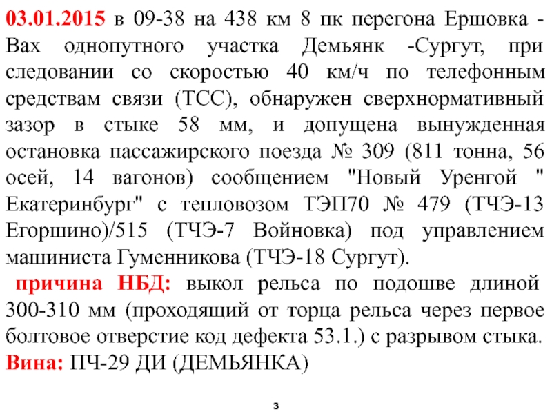 03.01.2015 в 09-38 на 438 км 8 пк перегона Ершовка - Вах однопутного участка Демьянк -Сургут, при следовании со скоростью 40 км/ч по телефонным средствам связи (ТСС), обнаружен сверхнормативный зазор в