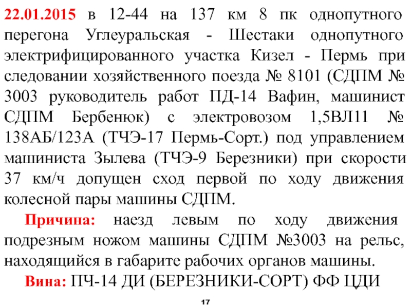 следовании хозяйственного поезда № 8101 (СДПМ № 3003 руководитель работ ПД-14 Вафин, машинист СДПМ Бербенюк) с электровозом 1,5ВЛ11 № 138АБ/123А (ТЧЭ-17 Пермь-Сорт.) под управлением машиниста Зылева (ТЧЭ-9 Березники) при скорости 37 км/ч допущен сход первой по ходу движения колесной пары машины СДПМ.