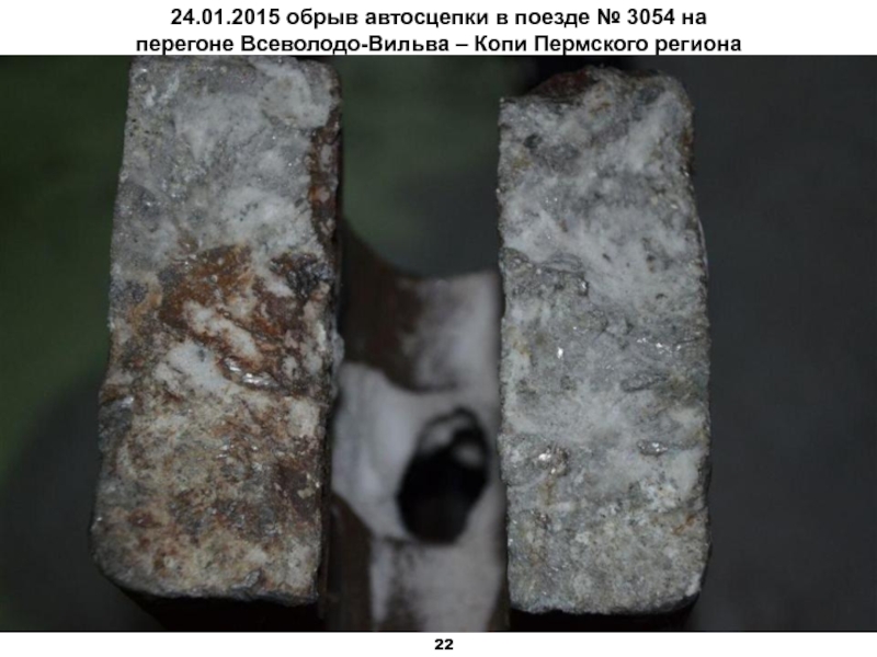 Слайд 2224.01.2015 обрыв автосцепки в поезде № 3054 на