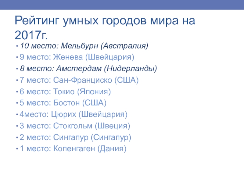 Рейтинг умных городов мира на 2017г.10 место: Мельбурн (Австралия)9 место: Женева (Швейцария)8 место: Амстердам (Нидерланды)7 место: Сан-Франциско