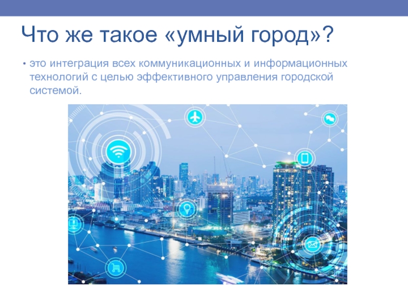 Что же такое «умный город»? это интеграция всех коммуникационных и информационных технологий с целью эффективного управления городской системой.