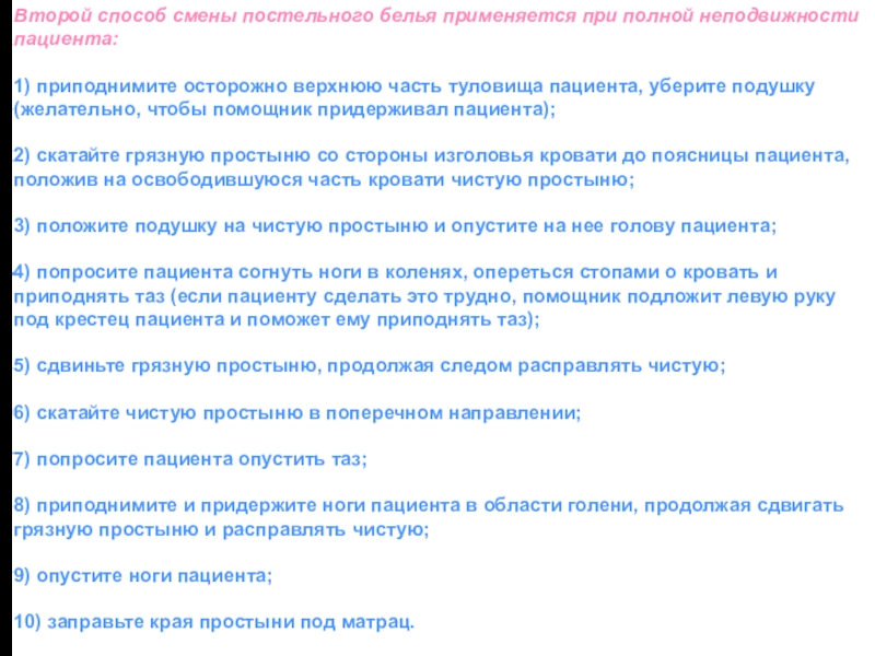 постели: 1) скатайте чистую простыню по длине до половины;2)поднимите голову пациента и уберите подушку;