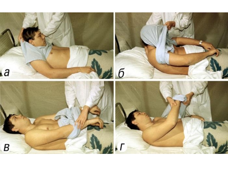 7)поверните пациента на спину, затем на другой бок так, чтобы он оказался на чистой простыне;