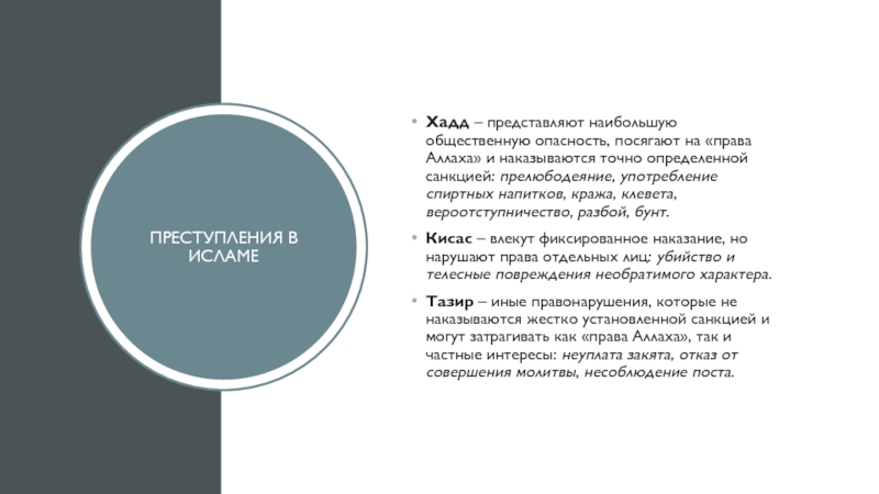 напитков, кража, клевета, вероотступничество, разбой, бунт.Кисас – влекут фиксированное наказание, но нарушают права отдельных лиц: убийство и телесные повреждения необратимого характера.