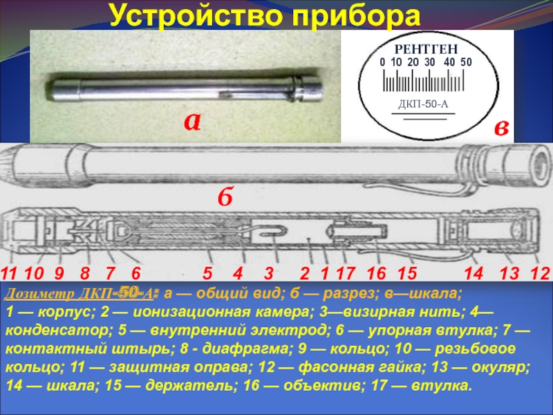 1 — корпус; 2 — ионизационная камера; 3—визирная нить; 4— конденсатор; 5 — внутренний электрод; 6 — упорная втулка; 7 — контактный штырь; 8 - диафрагма; 9 — кольцо; 10 — резьбовое кольцо; 11 — защитная оправа; 12 — фасонная гайка; 13 — окуляр; 14 — шкала; 15 — держатель; 16 — объектив; 17 — втулка.
