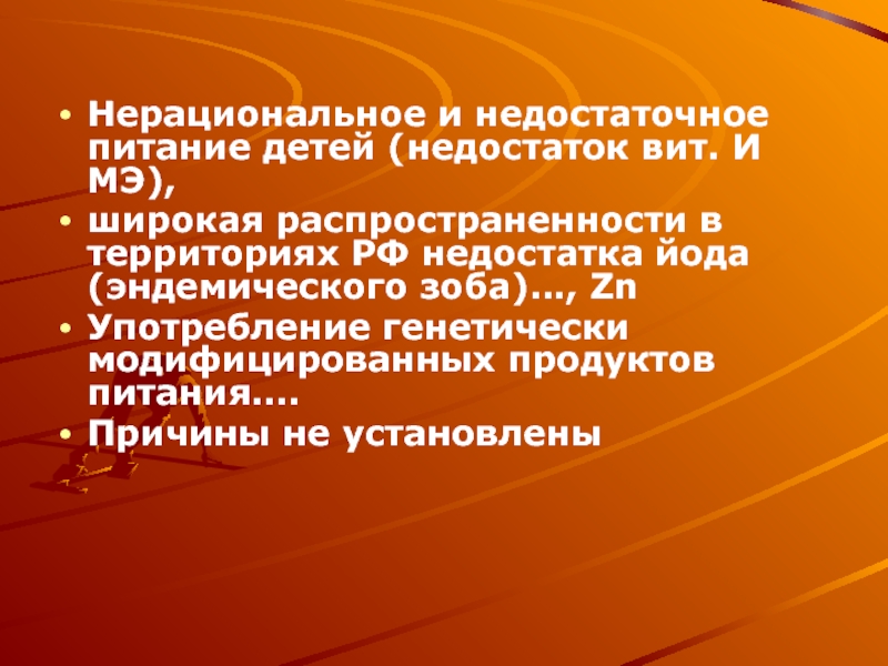 Слайд 117Нерациональное и недостаточное питание детей (недостаток вит. И МЭ),