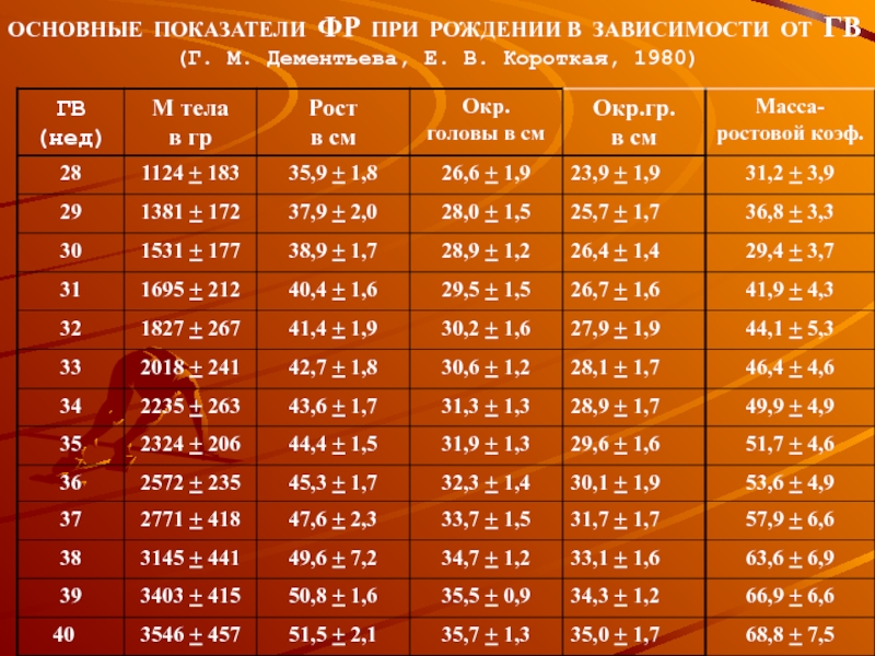Слайд 14ОСНОВНЫЕ ПОКАЗАТЕЛИ ФР ПРИ РОЖДЕНИИ В ЗАВИСИМОСТИ ОТ ГВ