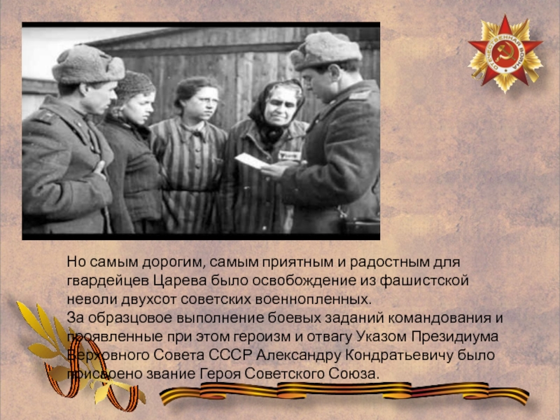 Слайд 13Но самым дорогим, самым приятным и радостным для гвардейцев Царева