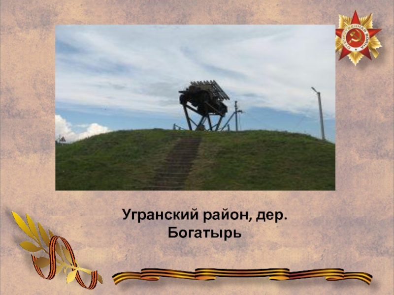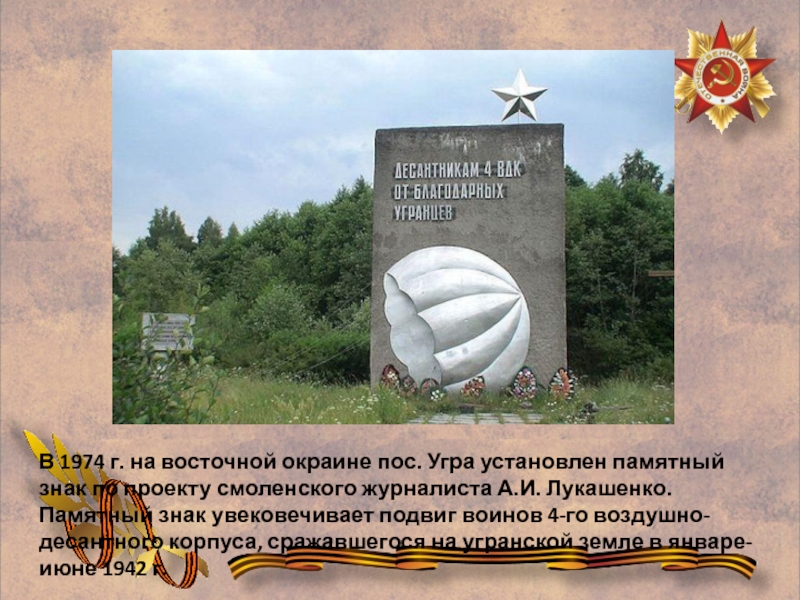 Слайд 18В 1974 г. на восточной окраине пос. Угра установлен памятный