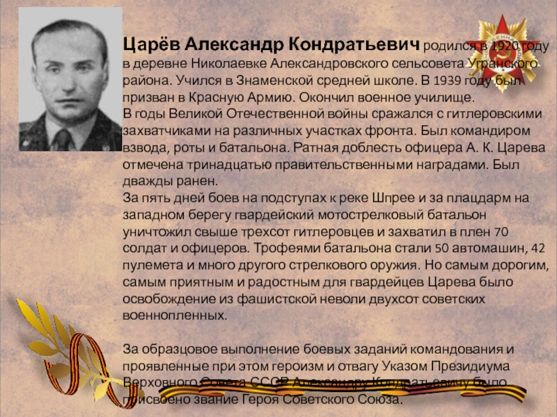 Слайд 12Царёв Александр Кондратьевич родился в 1920 году в деревне Николаевке Александровского