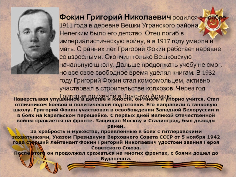войну, а в 1917 году умерла и мать. С ранних лет Григорий Фокин работает наравне со взрослыми. Окончил только Вешковскую начальную школу. Дальше продолжать учебу не смог, но все свое свободное время уделял книгам. В 1932 году Григорий Фокин стал комсомольцем, активно участвовал в строительстве колхозов. Через год Григория призвали в Красную Армию.