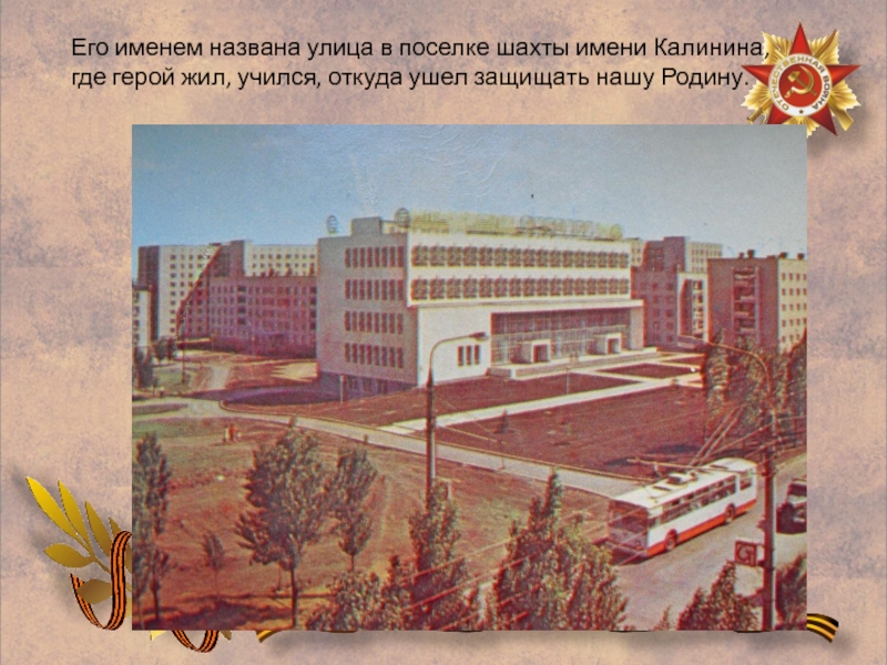 Слайд 7Его именем названа улица в поселке шахты имени Калинина, где