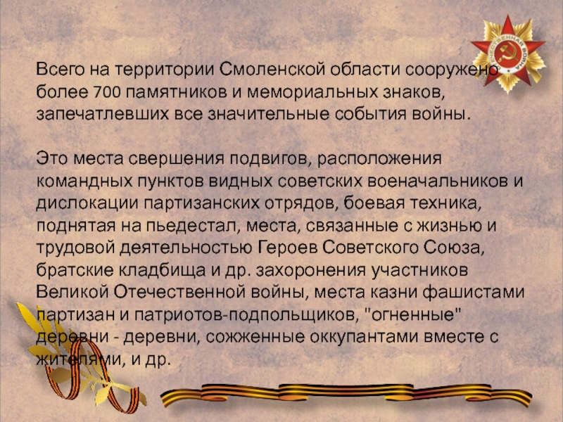 Слайд 19Всего на территории Смоленской области сооружено более 700 памятников и