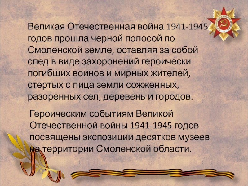 Слайд 14Великая Отечественная война 1941-1945 годов прошла черной полосой по Смоленской