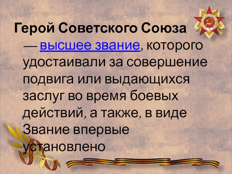 Слайд 5Герой Советского Союза — высшее звание, которого удостаивали за совершение подвига