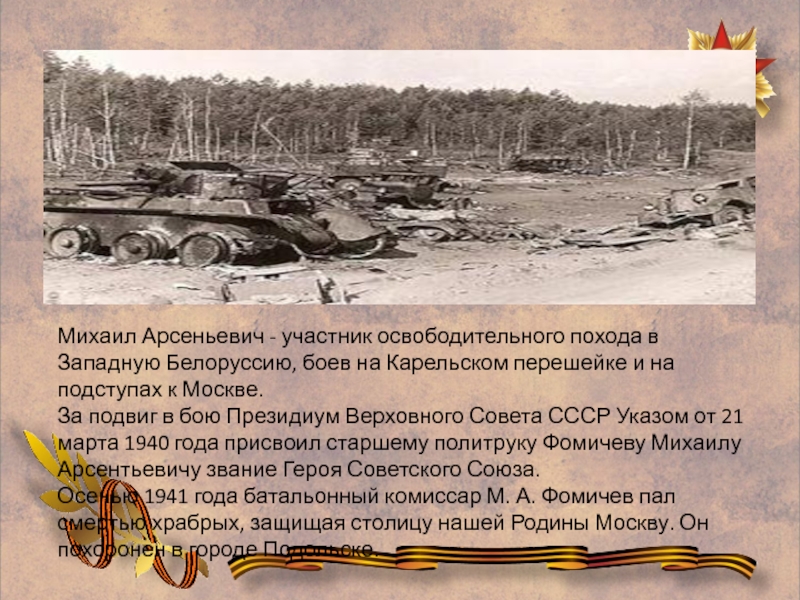 Слайд 11Михаил Арсеньевич - участник освободительного похода в Западную Белоруссию, боев
