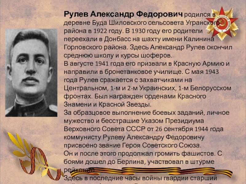 Рулев Александр Федорович родился в деревне Буда Шиловского сельсовета Угранского района
