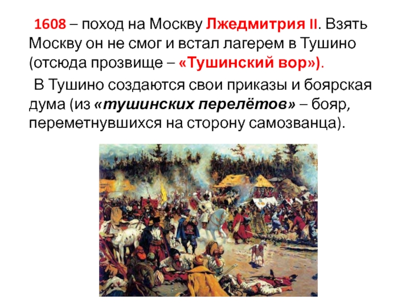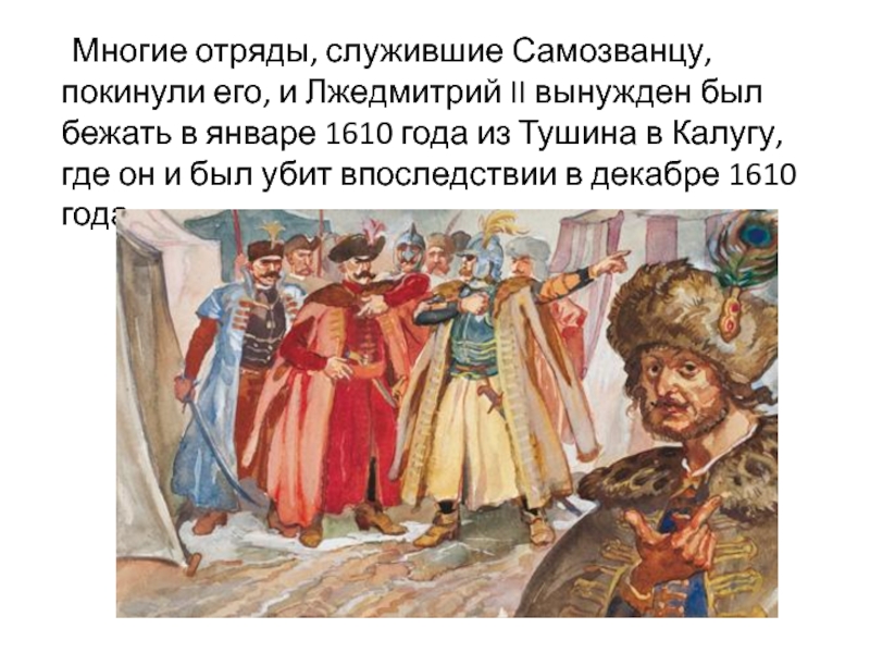 Слайд 48 Многие отряды, служившие Самозванцу, покинули его, и Лжедмитрий II вынужден