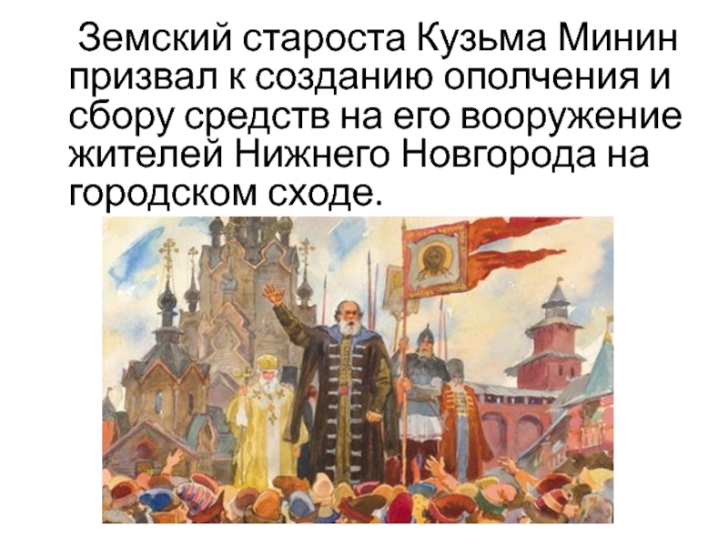 Слайд 59 Земский староста Кузьма Минин призвал к созданию ополчения и сбору