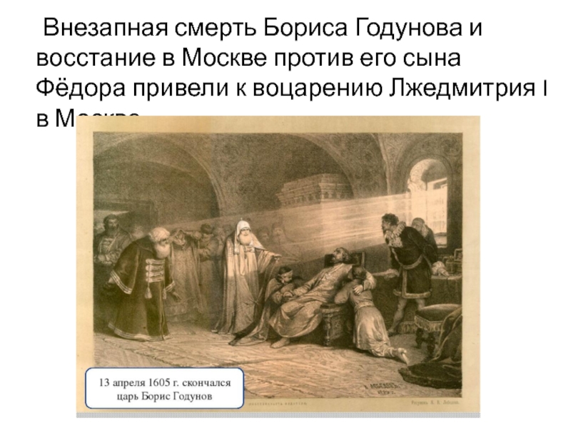 Слайд 25 Внезапная смерть Бориса Годунова и восстание в Москве против его