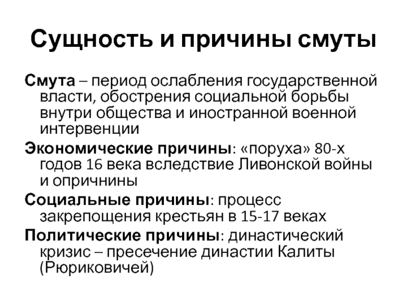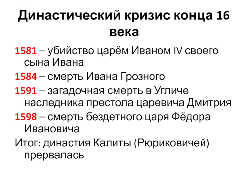 Политические причины: династический кризис – пресечение династии Калиты (Рюриковичей)